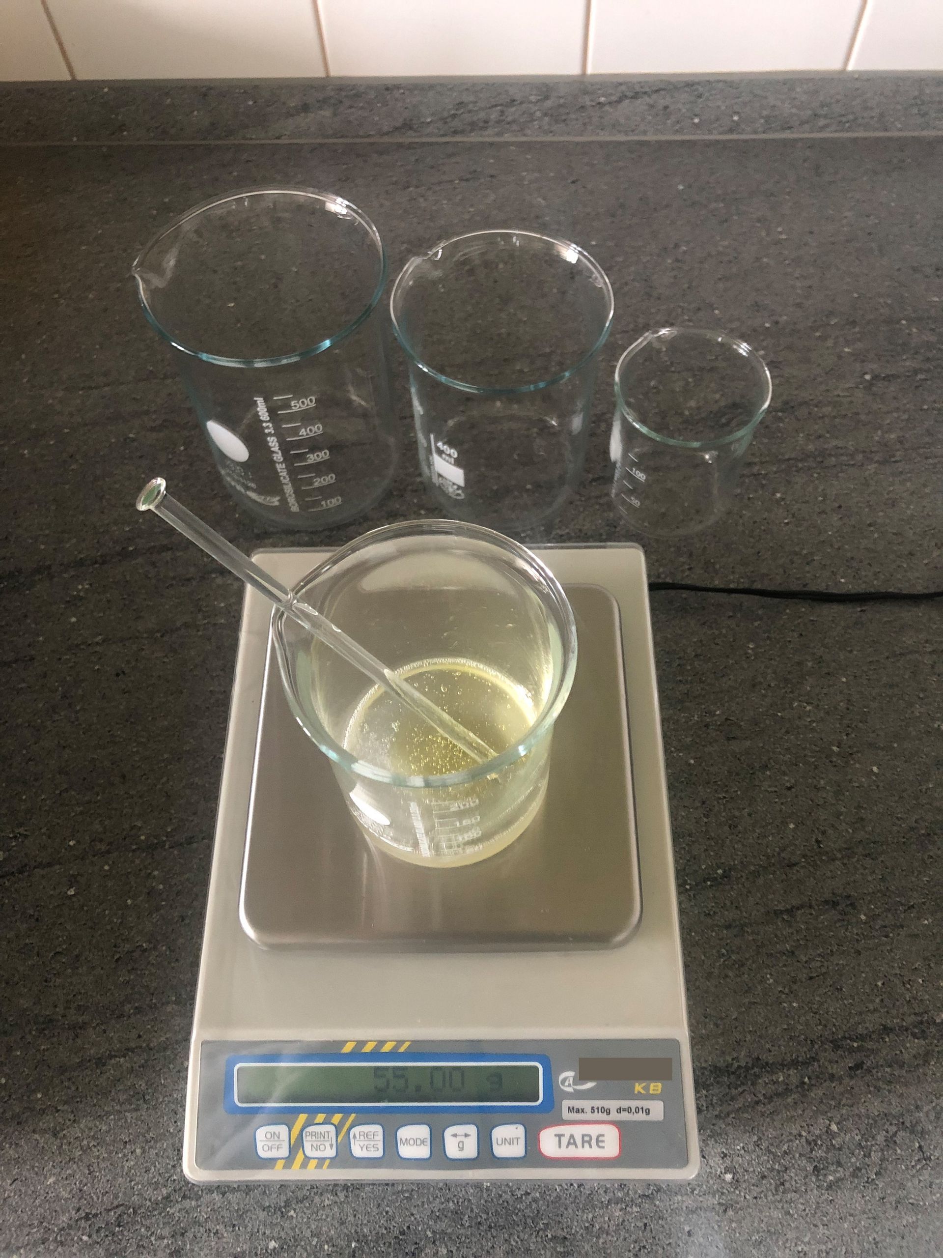 Soll Wasser mit Fett, also Öl gemischt werden, benötigst du einen Emulgator und eine hochtourige Rührmethode (ich verwende den Pürierstab meines Handmixers).